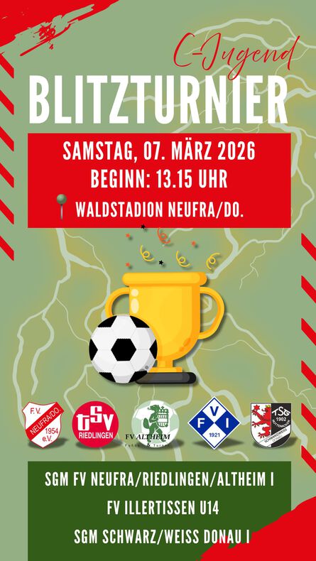Nach einer erfolgreichen Vorrunde startet unsere C-Junioren am kommenden Samstag mit einem Blitzturnier in die Rückrunde. Mit dabei ist die spielstarke C-Jugend der SGM Schwarz/Weiß Donau, die in der Vorrunde ohne Punktverlust ihre Qualistaffel gewonnen hat. Als zweite Mannschaft die U14 des bayerischen Regionalligisten FV Illertissen. Der Gastgeber, die C-Jugend der SGM FV Neufra/FV Altheim/TSV Riedlingen, steht nach der Vorrunde mit 6 Siegen und 1 knappen Niederlage in der Regionenstaffel Süd 1, derzeit souverän auf dem zweiten Platz.